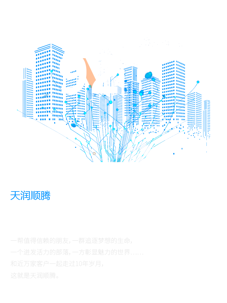 一幫值得信賴的朋友,一群追逐夢想的生命, 一個迸發活力的部落,一方彰顯魅力的世界…… 和近萬家客戶一起走過10年歲月, 這就是天潤順騰。
